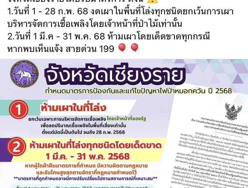1.วันที่ 1 – 28 ก.พ. 68 งดเผาในพื้นที่โล่งทุกชนิดยกเว้นการเผาบริหารจัดการเชื้อเพลิงโดยเจ้าหน้าที่ป่าไม้เท่านั้น
