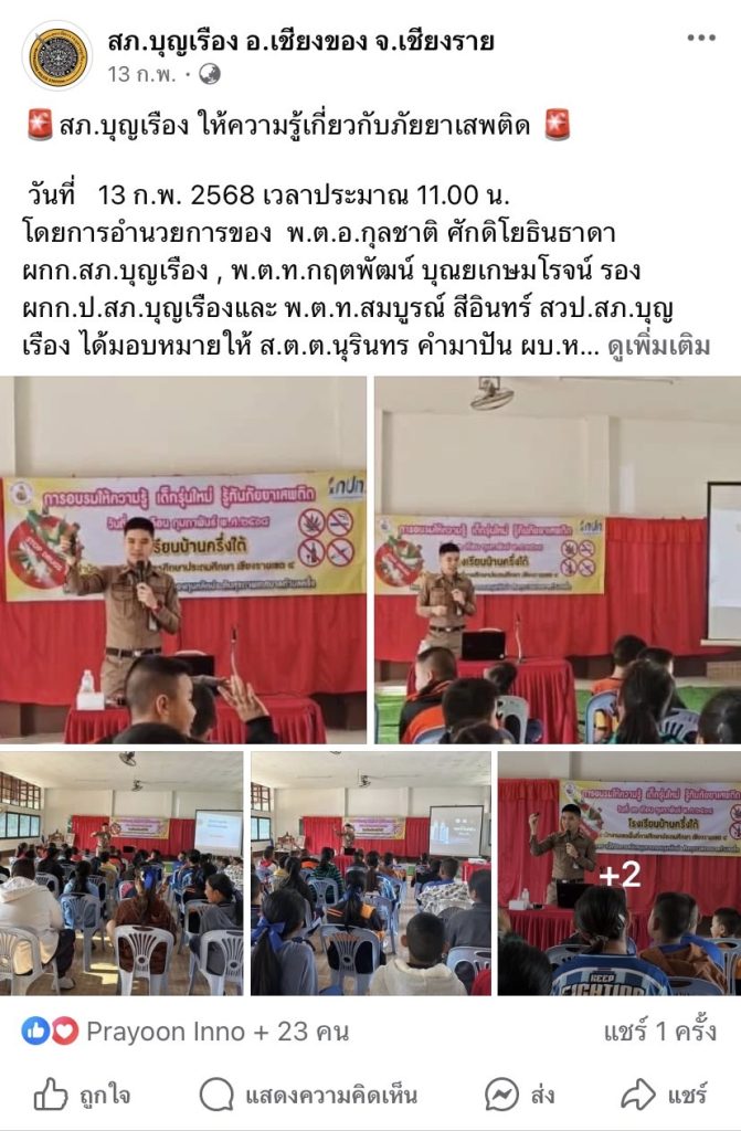 ได้มอบหมายให้ ส.ต.ต.นุรินทร คำมาปัน ผบ.หมู่ ป. สภ.บุญเรือง เป็นวิทยากร ให้ความรู้นักเรียน โครงการ เด็กรุ่นใหม่ รู้ทันภัยยาเสพติด โรงเรียนบ้านครึ่งใต้ ต.ครึ่ง อ.เชียงของ จว.เชียงราย