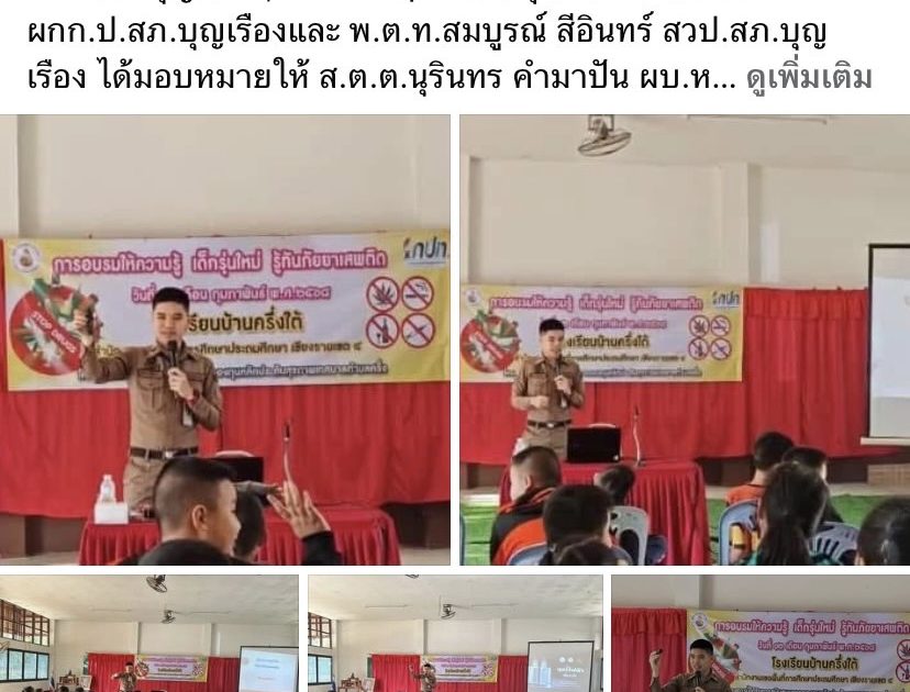 ได้มอบหมายให้ ส.ต.ต.นุรินทร คำมาปัน ผบ.หมู่ ป. สภ.บุญเรือง เป็นวิทยากร ให้ความรู้นักเรียน โครงการ เด็กรุ่นใหม่ รู้ทันภัยยาเสพติด โรงเรียนบ้านครึ่งใต้ ต.ครึ่ง อ.เชียงของ จว.เชียงราย